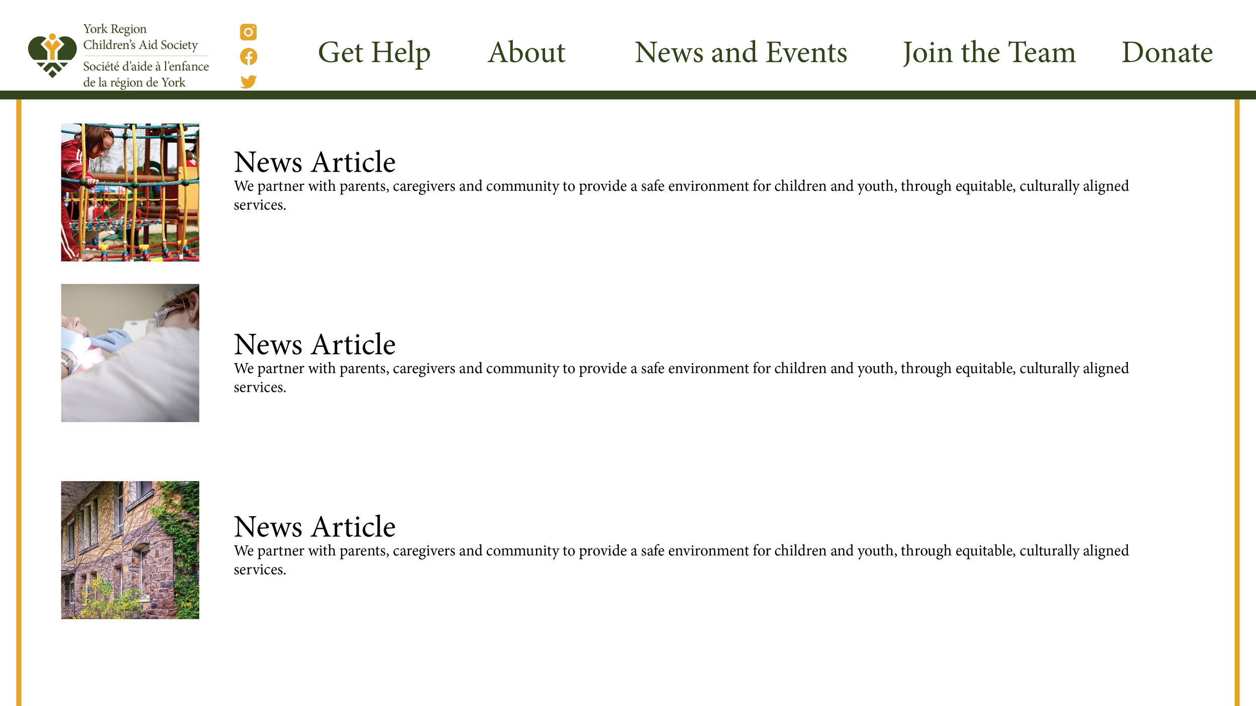 As part of the 2025 RGD Project-Based Mentorship Program, the team was tasked with redesigning the existing York Region Children's Aid Society website to align with modern web standards. This included the development of a new logo and high-fidelity design elements. The 12-week project covered all phases from initial concept to final delivery, with each stage thoroughly documented.